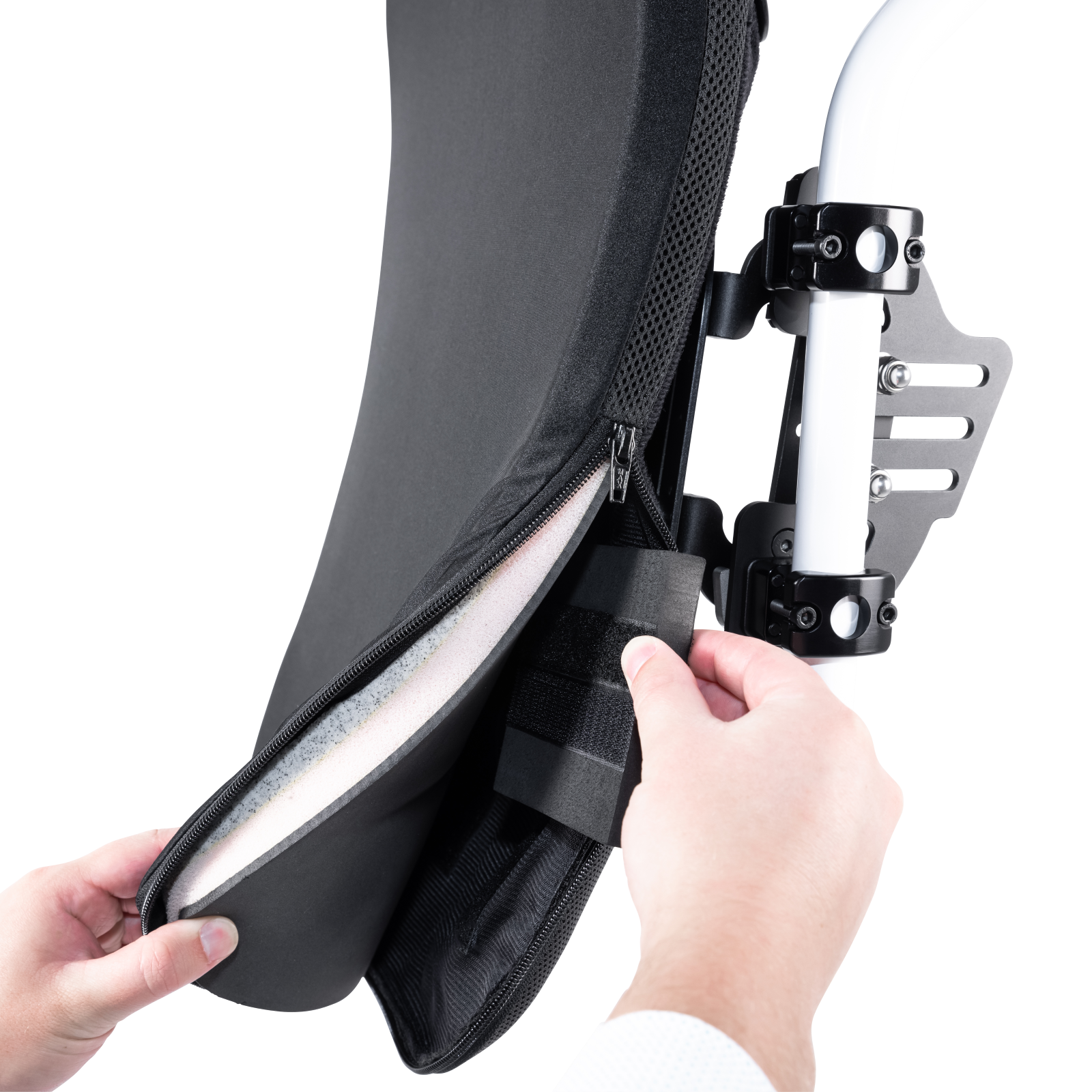 The Adapta² Back Support meets the needs of wheelchair users with complex postural presentations including lordosis, anterior pelvic tilt, and prominent gluteal shelf. The back support splits the rigid aluminium shell into two different sections that can be adjusted to achieve a natural contour to position and support the pelvis and spine. The Adapta² Back Support can provide the shape needed to support the user by contouring the rigid aluminium shell, rather than the foam padding.