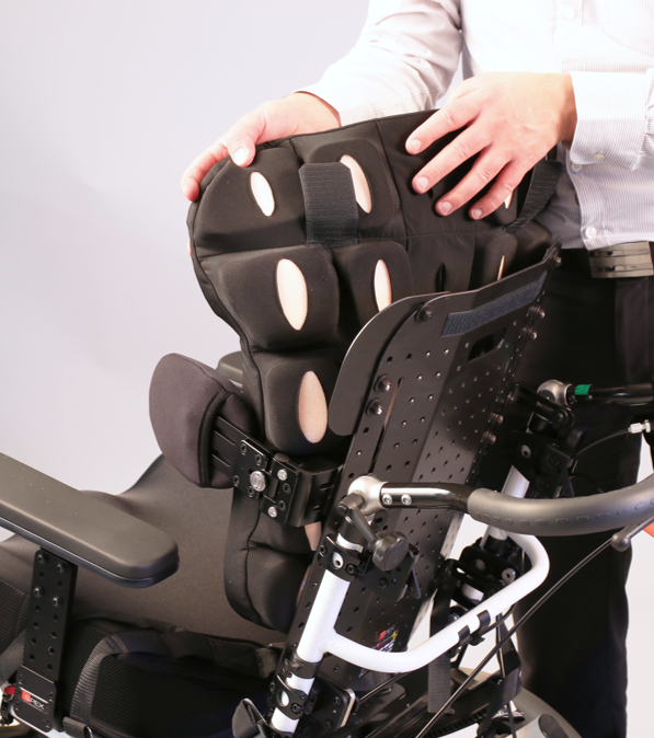 A special feature of the Spex back support is the adjustable contouring-cell cube system which incorporates into the upholstery unit of the backrest. Easy configurations are performed for asymmetrical trunk postures without the need for complicated custom/bespoke seating.