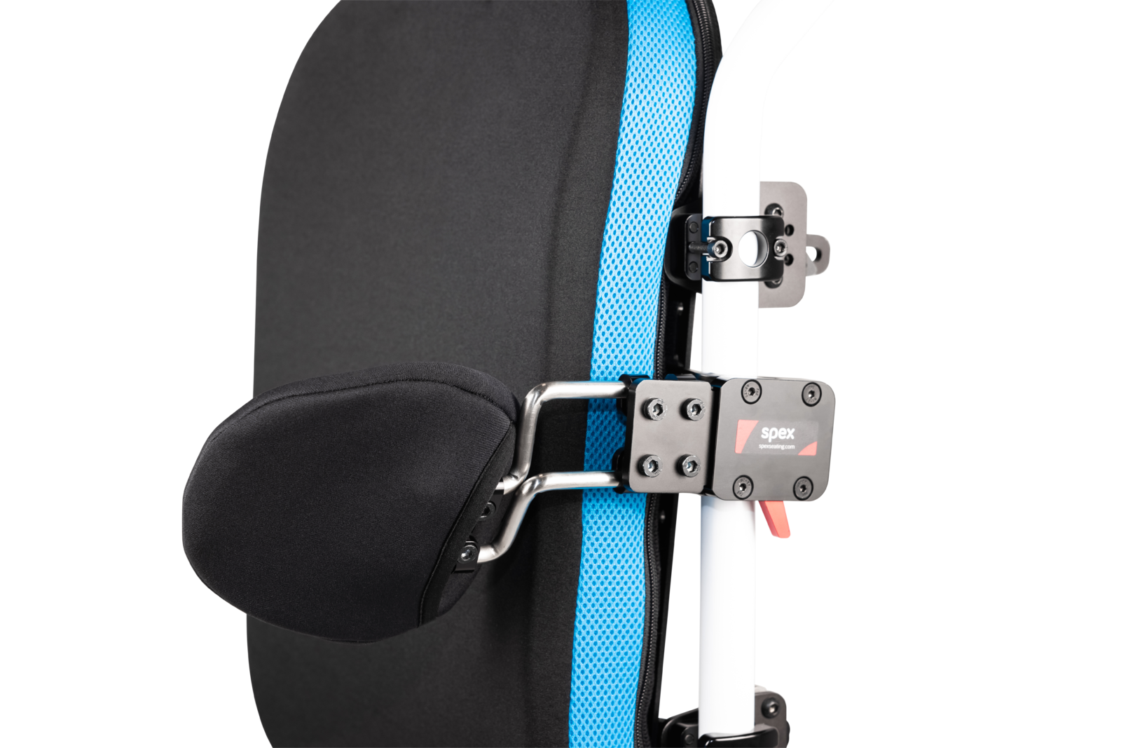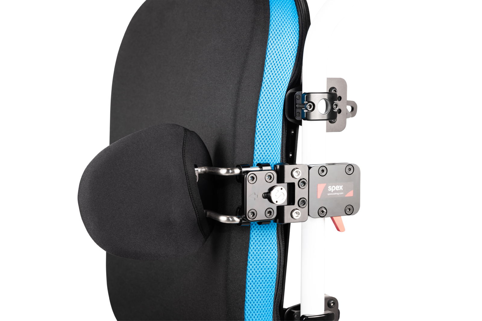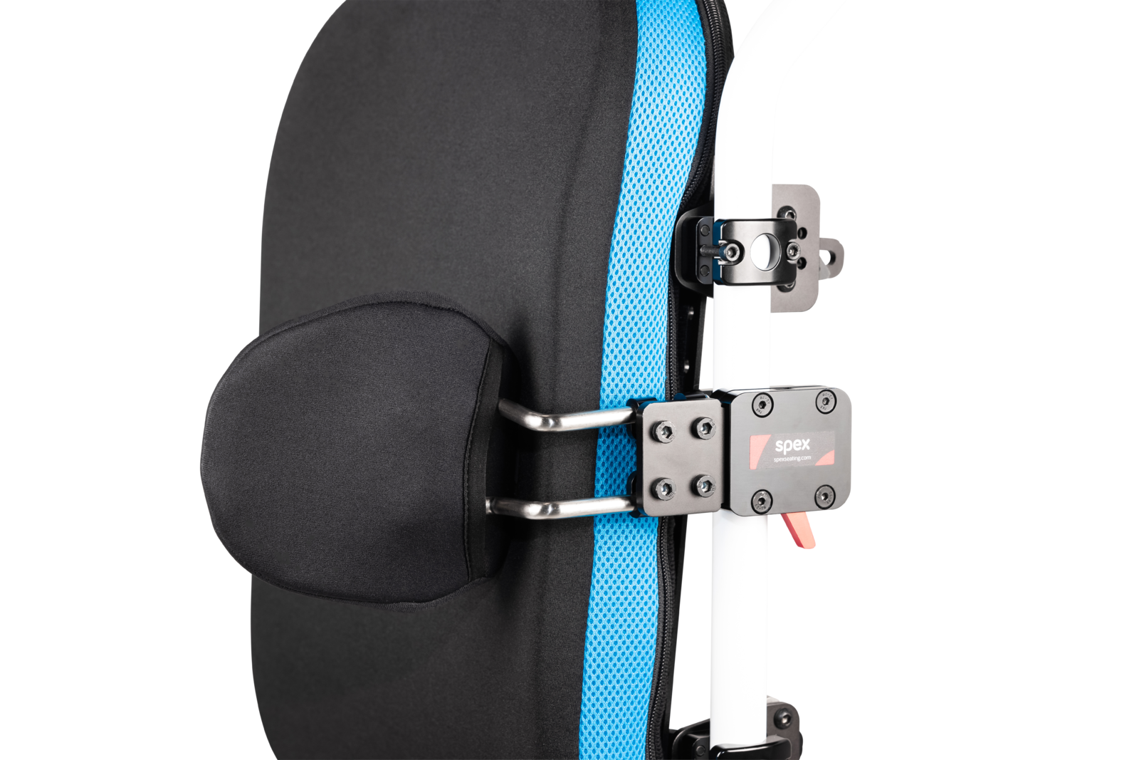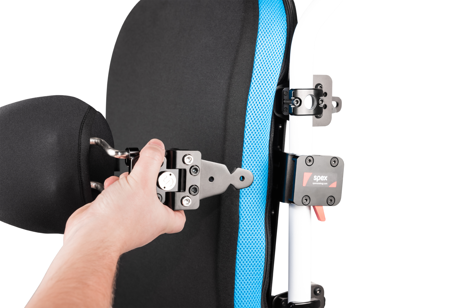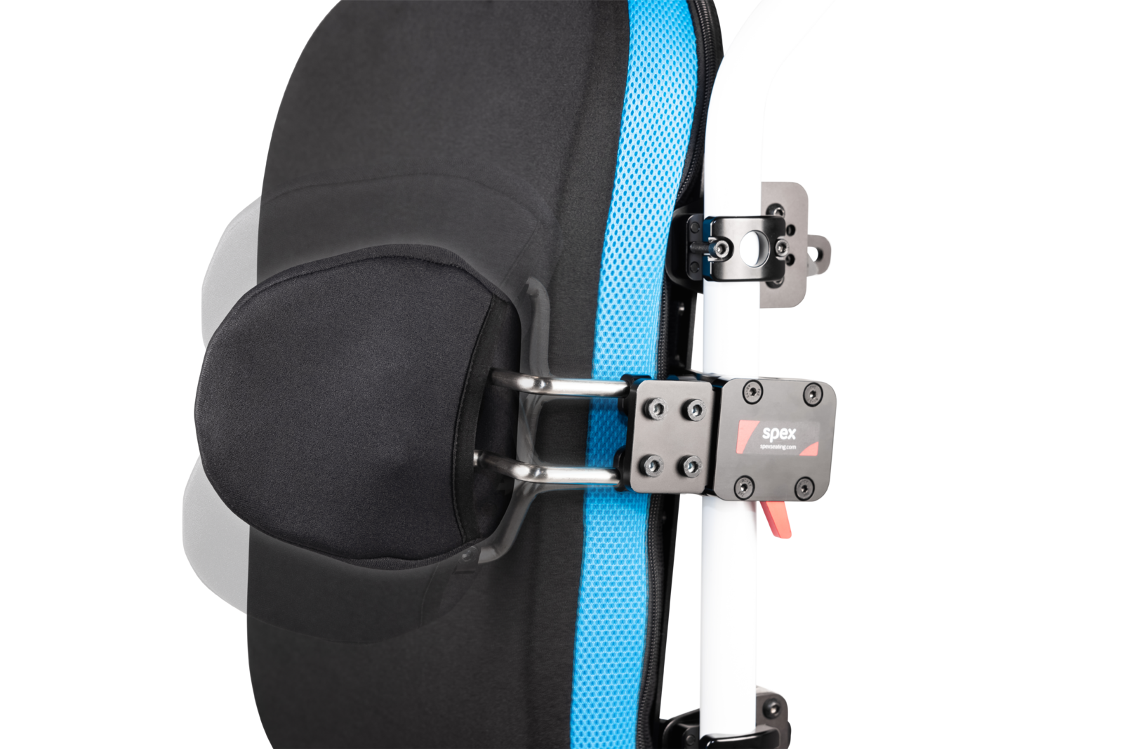 The latest design in Spex lateral support hardware features a Quick-Release mechanism, ideal for users who wish to easily remove their lateral support for transfers and other situations where laterals temporarily require removal from the wheelchair. Simple lever mechanism can be released by either user or carer. Available in a range of depth sizes to fit varying back support upholstery thicknesses, the Quick-Release hardware can be fitted to any of the Spex lateral trunk support pads. A locking pin provided for use in transport and to prevent unintentional release of the support.