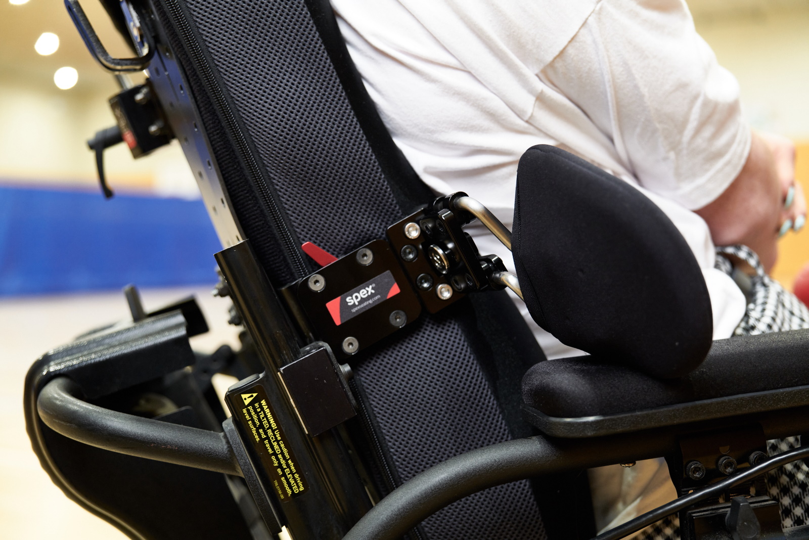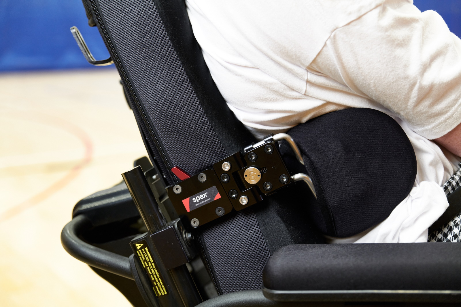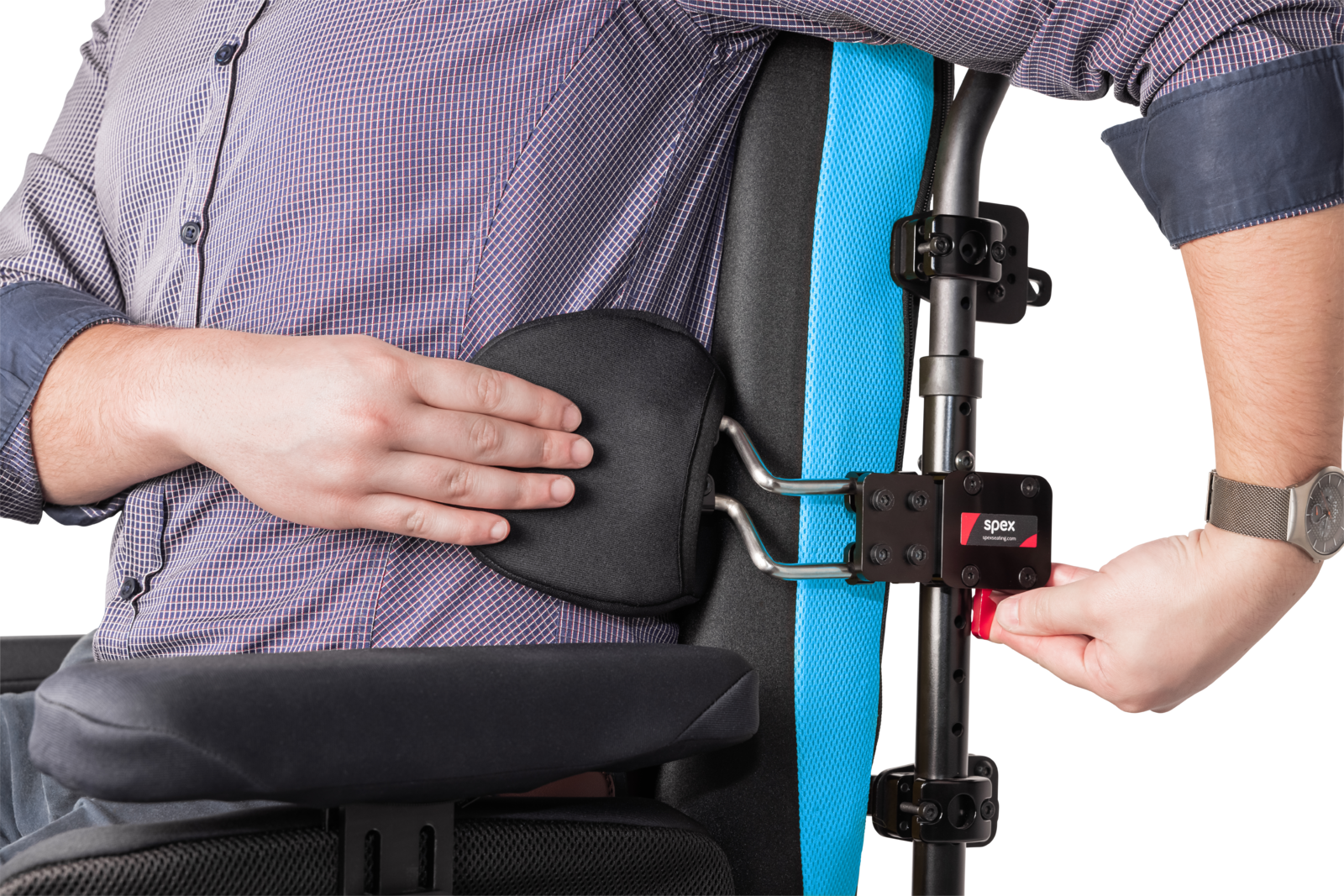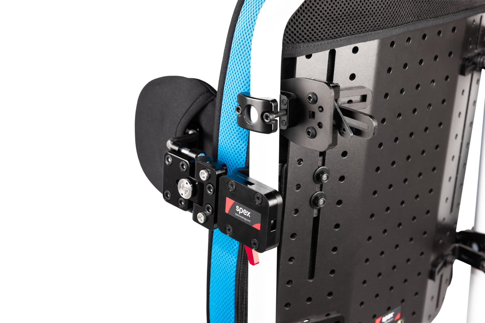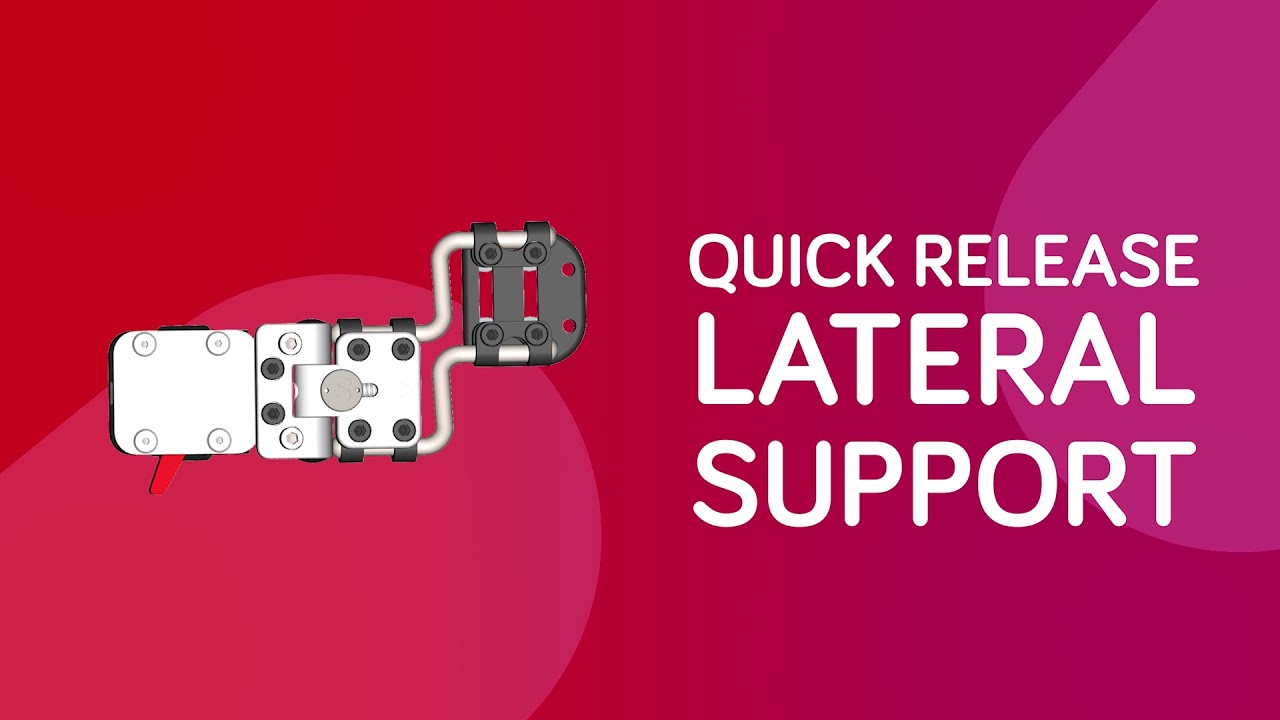 The latest design in Spex lateral support hardware features a Quick-Release mechanism, ideal for users who wish to easily remove their lateral support for transfers and other situations where laterals temporarily require removal from the wheelchair. Simple lever mechanism can be released by either user or carer. Available in a range of depth sizes to fit varying back support upholstery thicknesses, the Quick-Release hardware can be fitted to any of the Spex lateral trunk support pads. A locking pin provided for use in transport and to prevent unintentional release of the support.