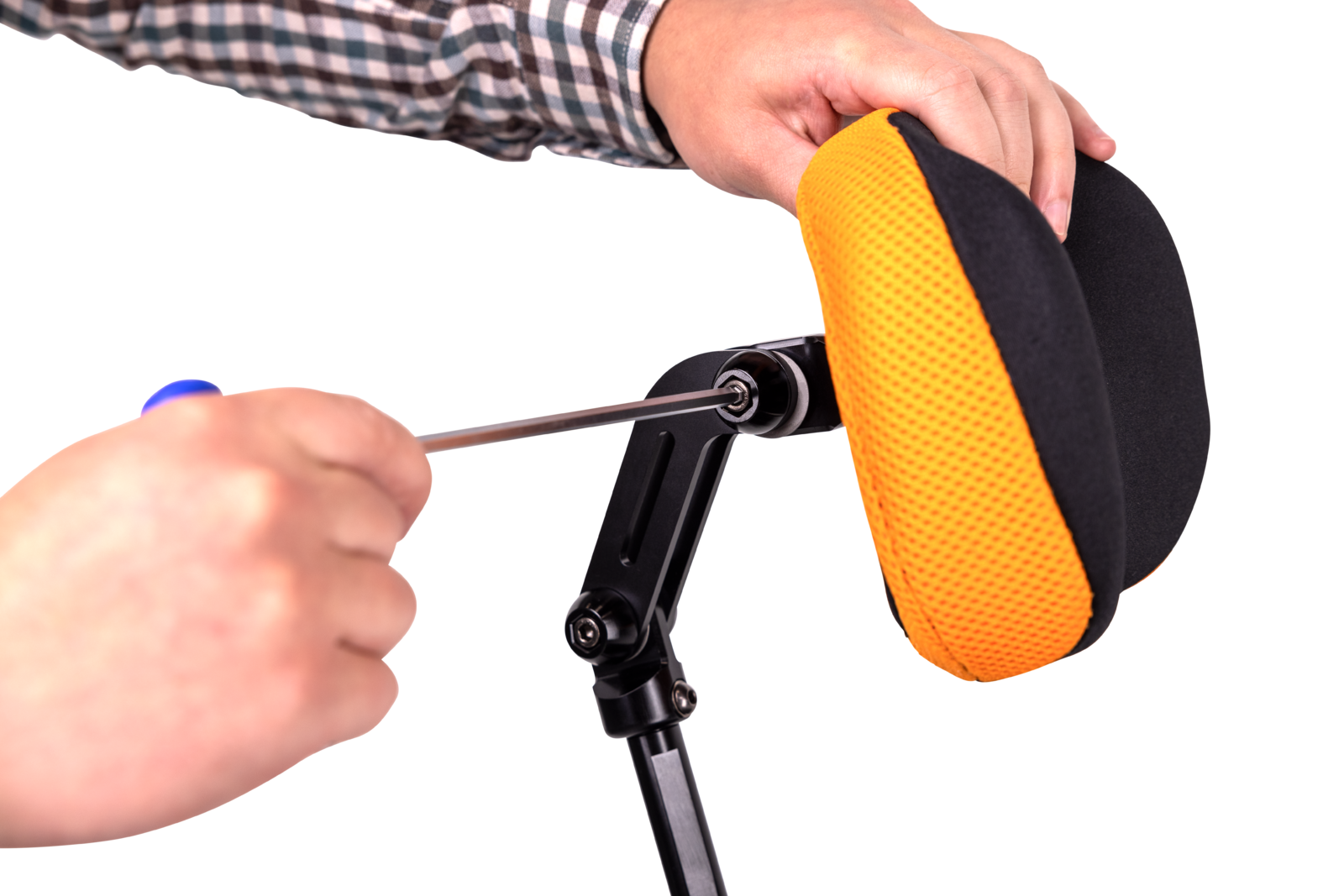 Simplicity and ease of adjustment are achieved with an easy setup design. The patent pending spherical hinge joints allow the head pad to be positioned forwards, backwards, rotated, and angled with only two bolts, providing the optimal support where it’s required.