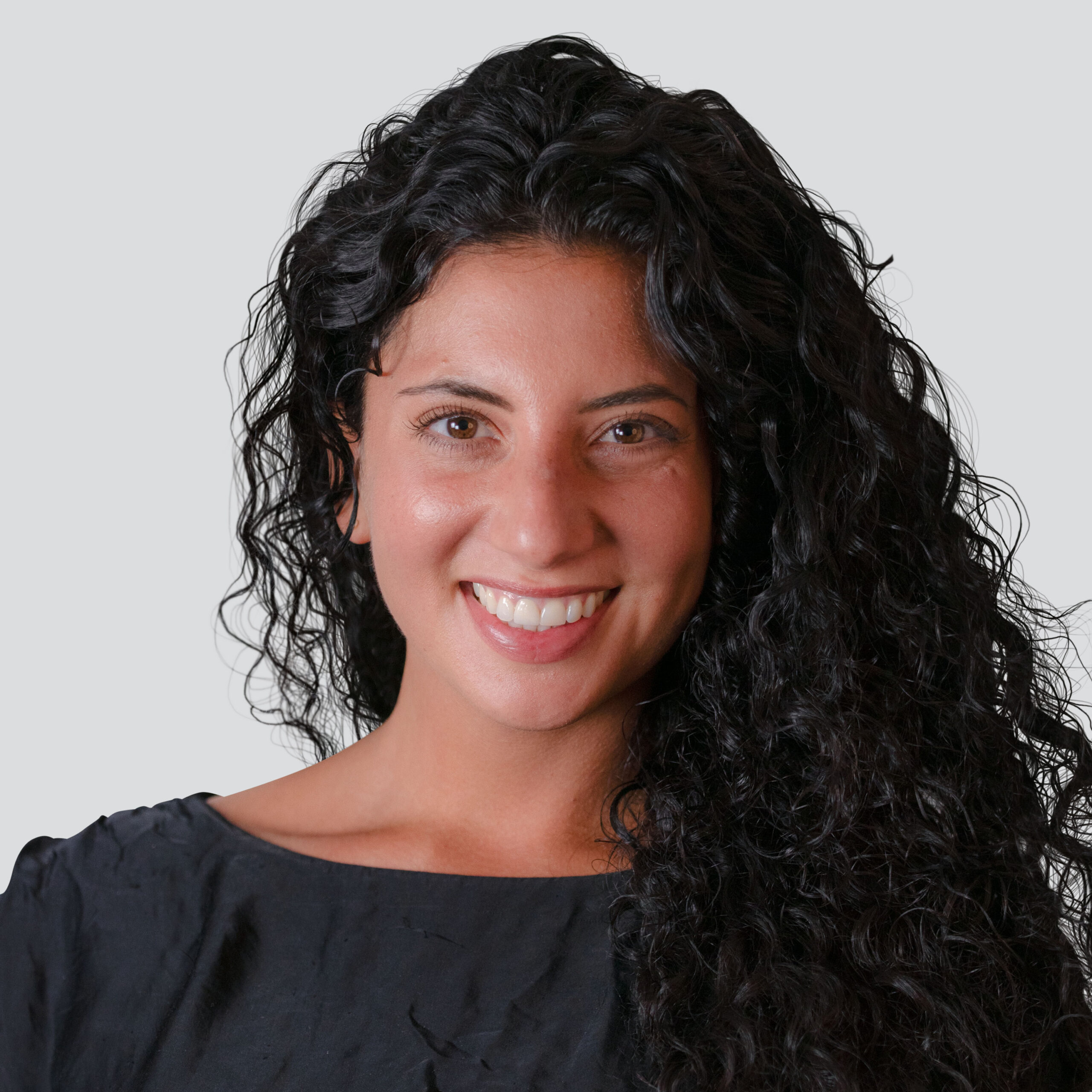 Corporate headshot of lady named Sofia Bello on a grey background.