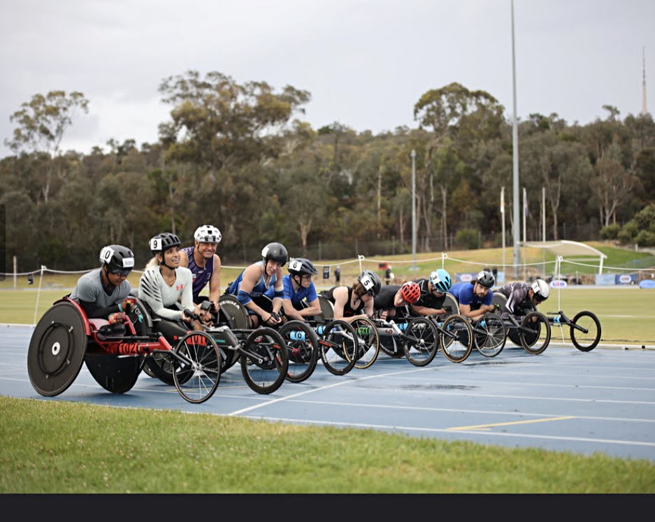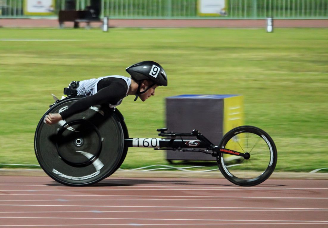 A photo of Paralympian, Jaden Movold during a track race in his wheelchair
