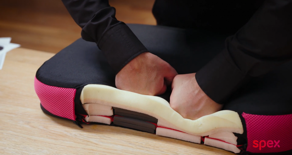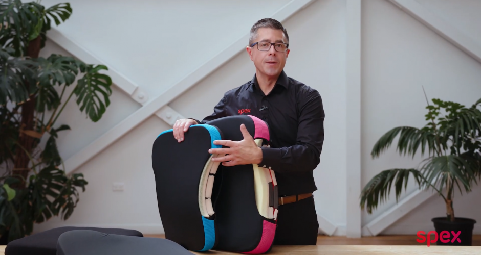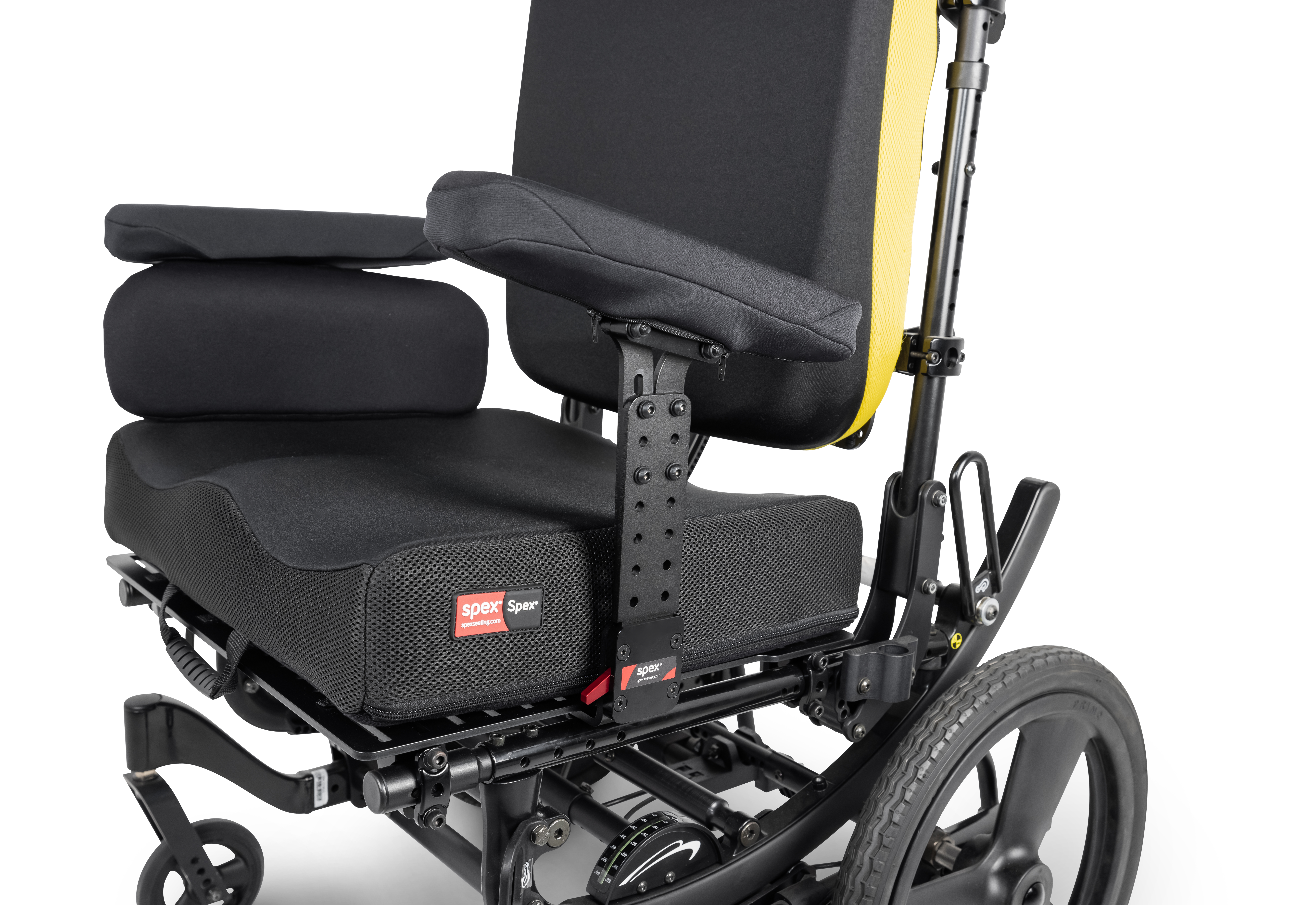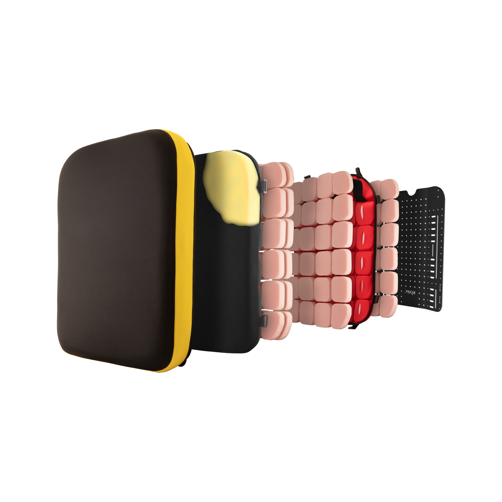 The contouring of the cushioning is essential to apply intimate surface contact to areas of the body that are contoured. The padded moulding structure is comprised of a three-layered Spex cube contouring substrate. The best result is achieved by creating areas of greater or lesser support with the adjustment of the multiple-layered padded pocket cells. We have developed 2 different densities of Spex cube cells in order to provide stability and comfort where it is needed. The SuperShape can adapt to changing needs and provide enough stability for complex and asymmetric postures