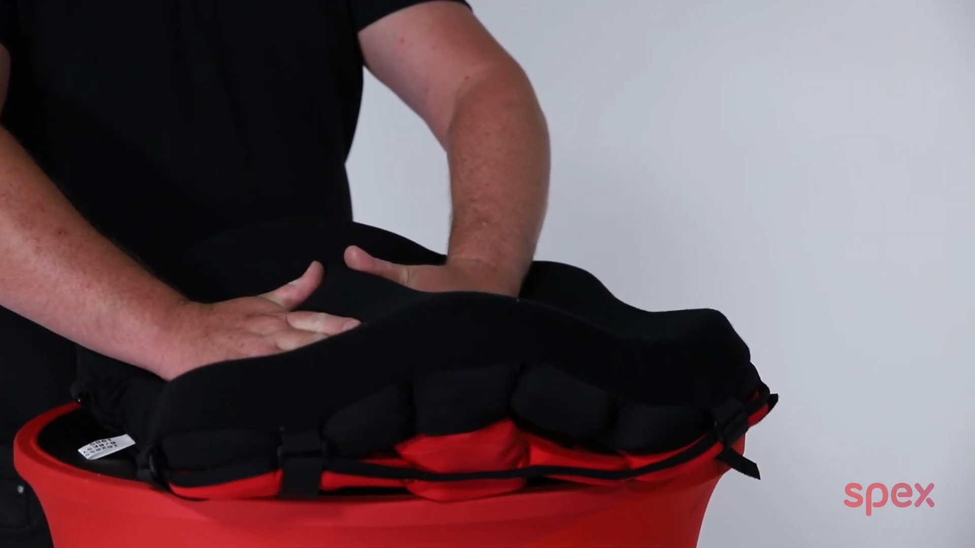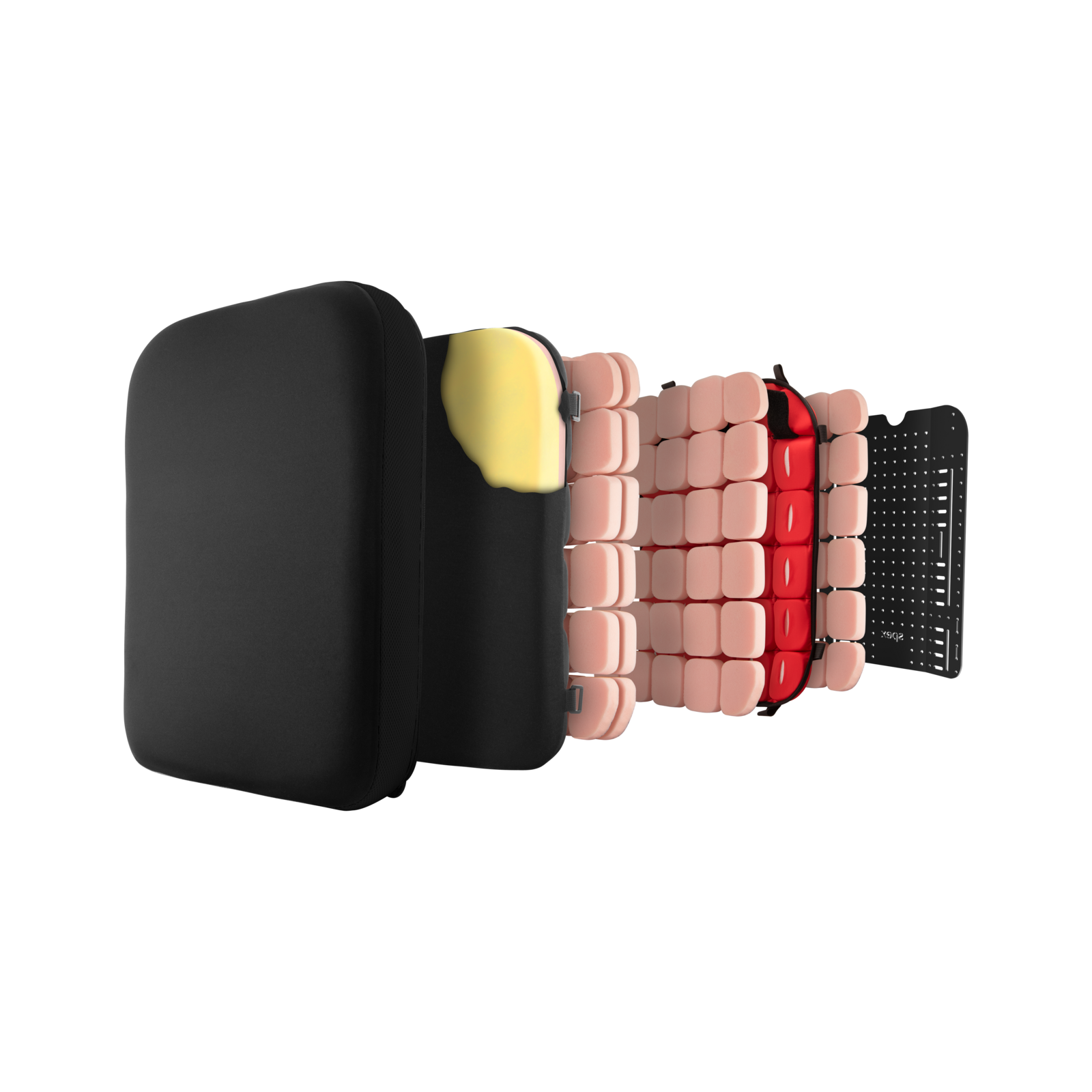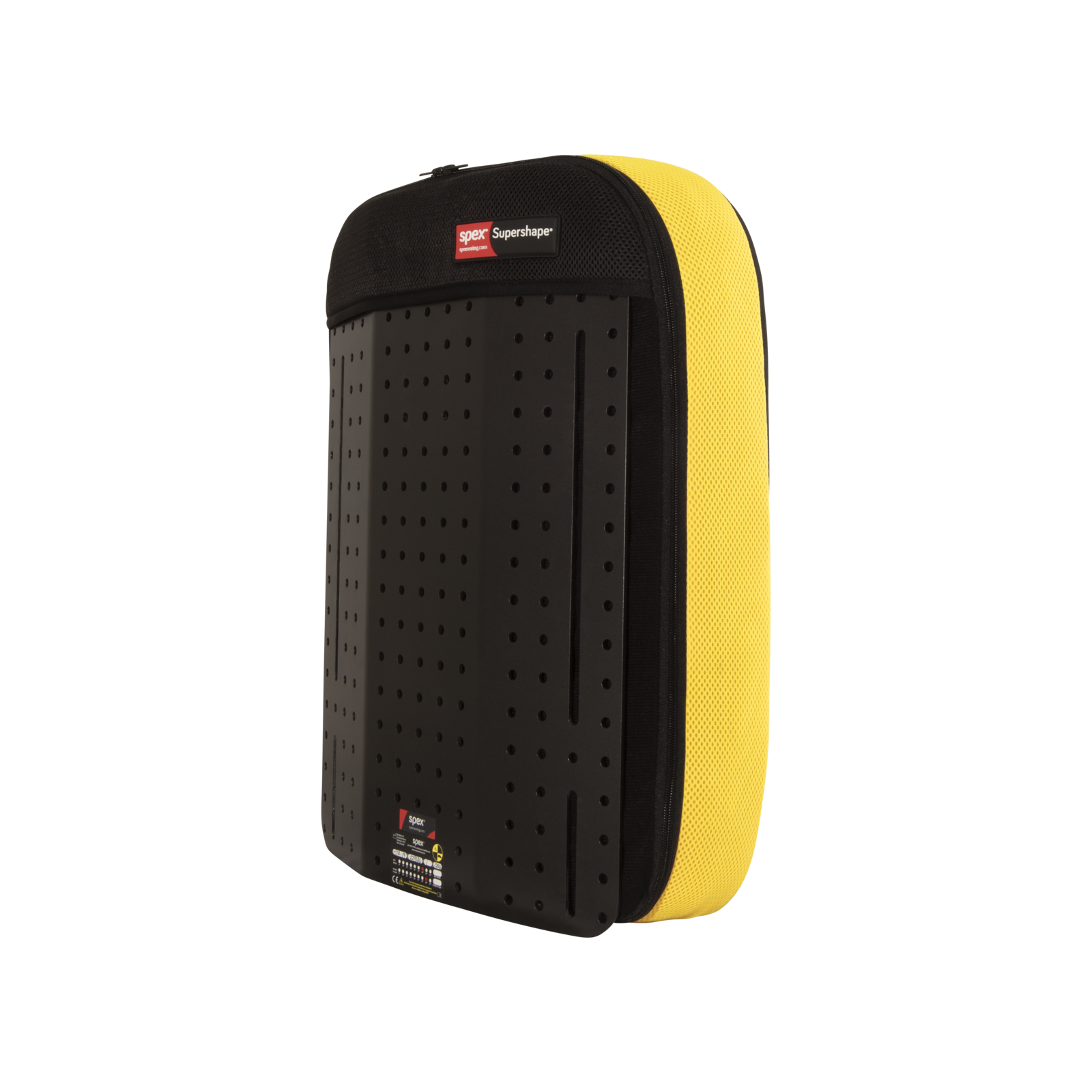 The contouring of the cushioning is essential to apply intimate surface contact to areas of the body that are contoured. The padded moulding structure is comprised of a three-layered Spex cube contouring substrate. The best result is achieved by creating areas of greater or lesser support with the adjustment of the multiple-layered padded pocket cells. We have developed 2 different densities of Spex cube cells in order to provide stability and comfort where it is needed. The SuperShape can adapt to changing needs and provide enough stability for complex and asymmetric postures
