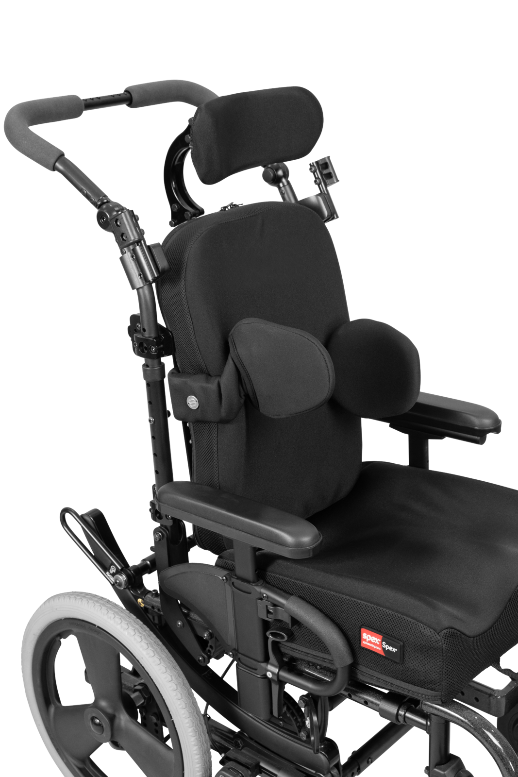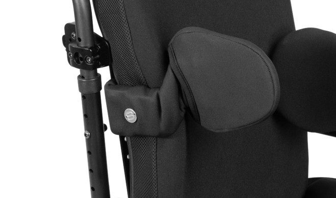 The Spex Axial Swing-Away Lateral Hardware, with its patented mechanically rotational system ensures that the user’s trunk is always kept well supported even in the most challenging positions. A well-fitting lateral support will improve balance, posture, and comfort in the wheelchair.
