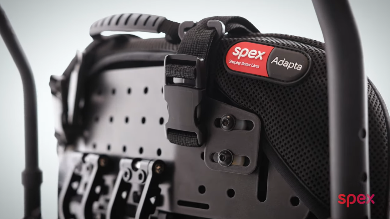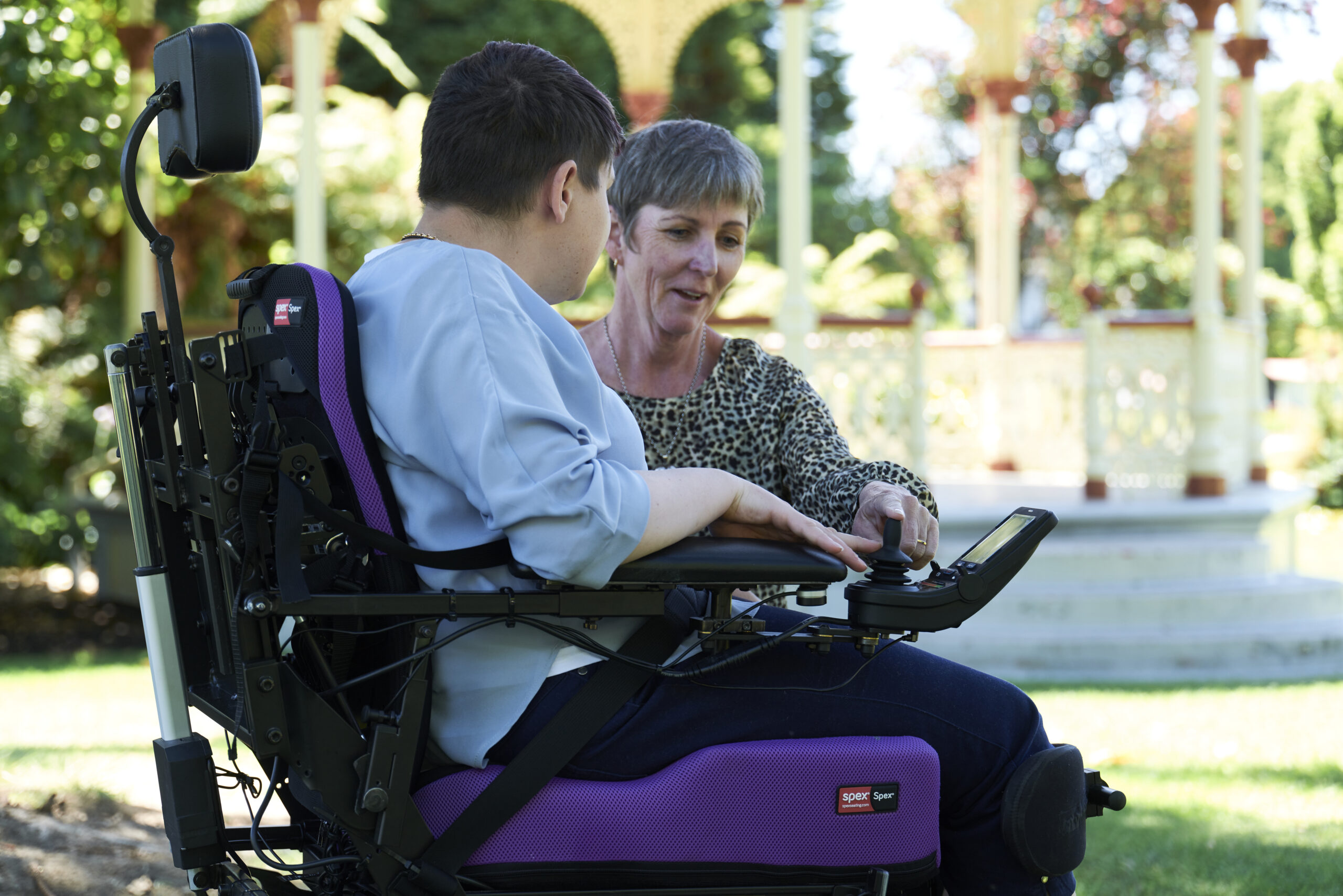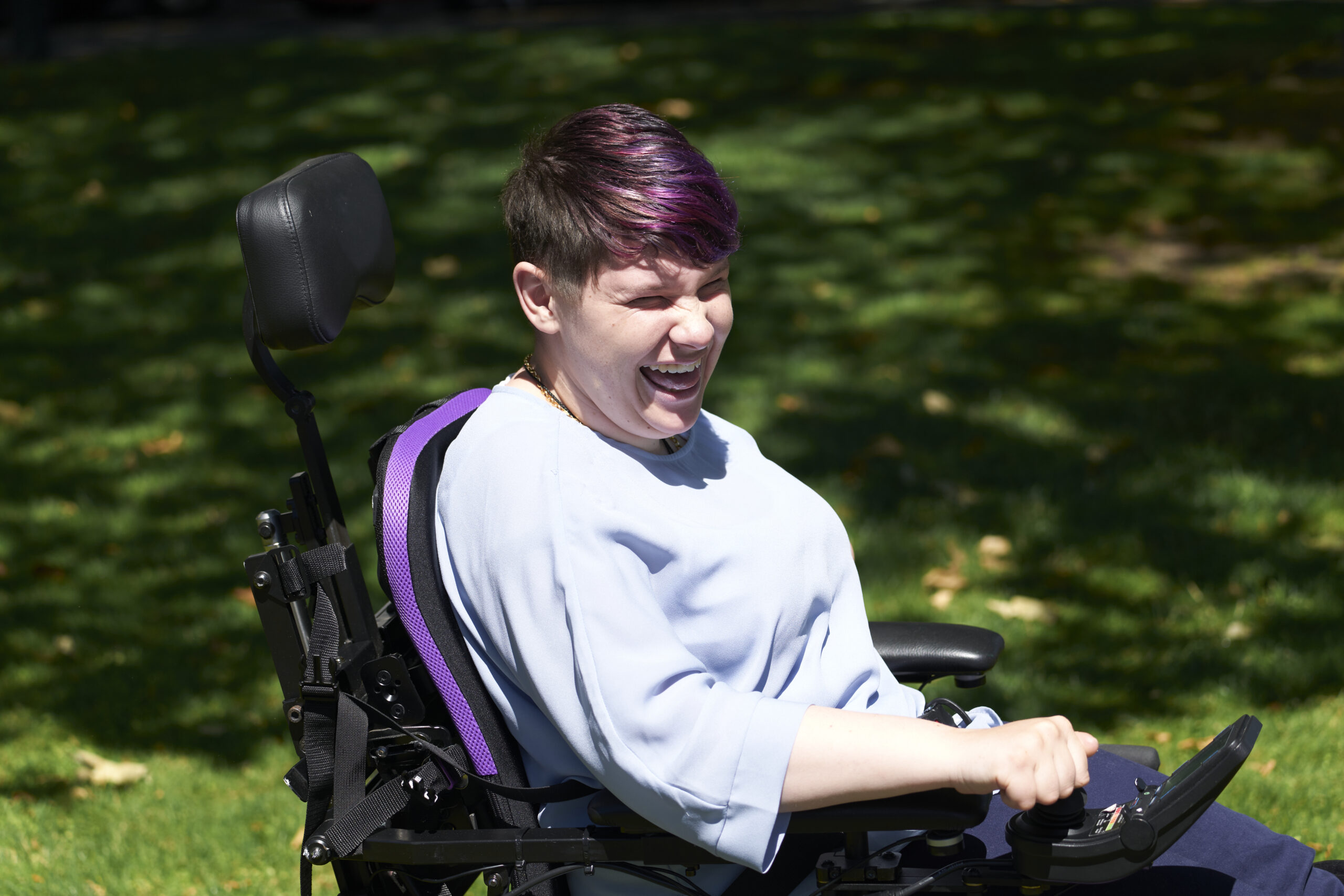 Nikayla smiling in the sun as she enjoys active daily life with purple Spex seating, benefiting from improved posture and mobility support.