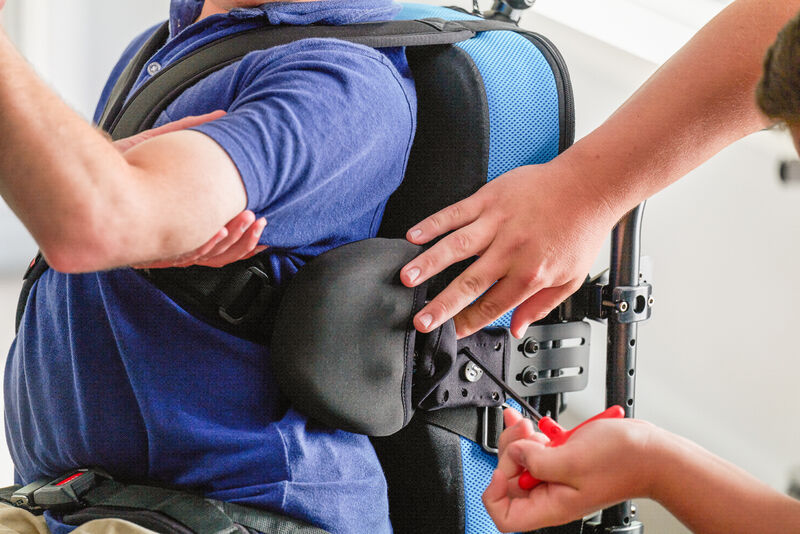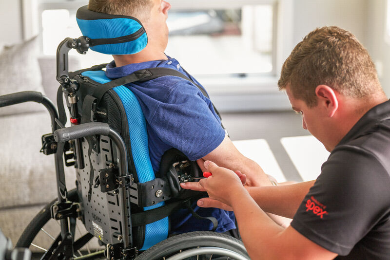 Callum has a Spex SuperShape back support fitted to his chair which has allowed the contouring created by the curve in his back to be completely mapped out and filled to support his rotation and scoliosis. As his spine has spinal fusion rods, a lot of the unique Spex foam cubes have been used to build up contouring with the shape of the back support on his left. Cubes we also removed on the right to allow his shoulder to come back into the back support to prevent further rotation of his spine. We have used our Tessellated Shape Elements (TSS) to give further firm support to prevent his spine from collapsing on the left side. This has given Callum so much stability and allows his back support to be altered as his body shape changes, which is especially important as he is working out at the gym a lot.