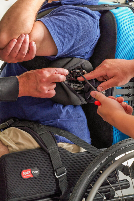The Spex Centrepoint anterior shoulder harness keeps Callum’s shoulders back to prevent any more rotation and to stop him from falling forwards.